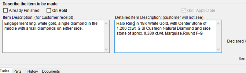 Your screen should appear similar to the example provided below, with both description fields clearly completed to ensure accuracy and clarity for both the customer and workshop.