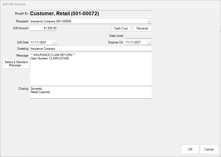 - In the Gift Voucher details screen, Click the Select a Standard Message button and choose the "Claim – Insurance" template.