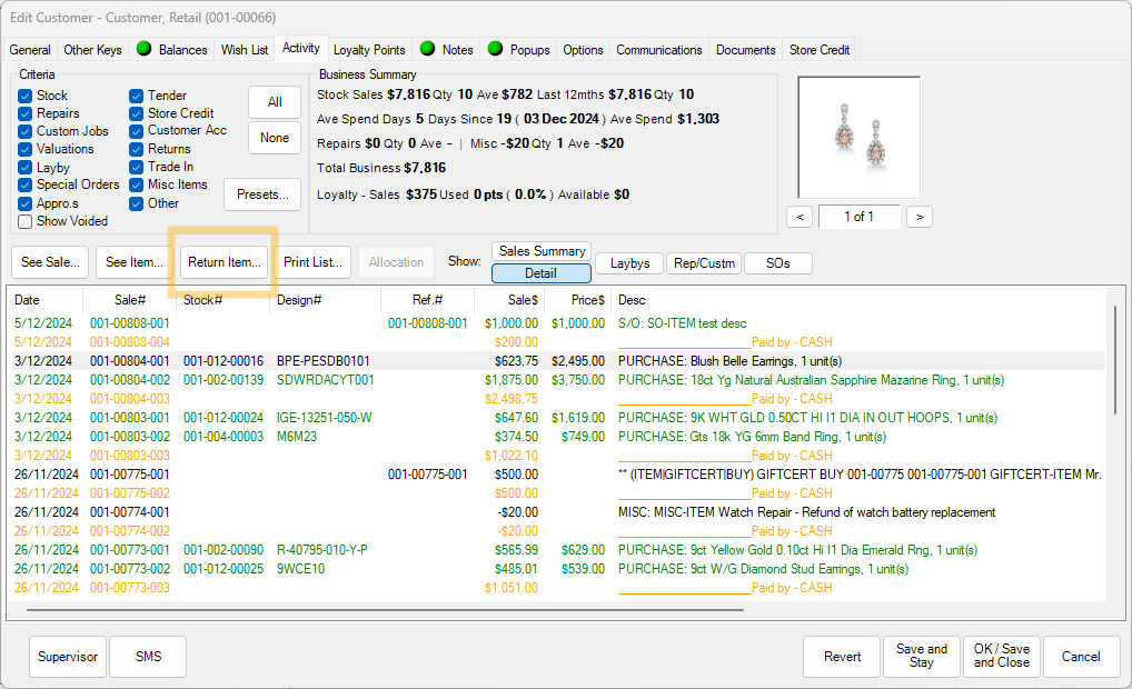- Highlight the transaction and click Return Item to add the item to the POS screen as a return.