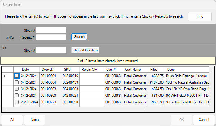 TIP: If the item is not in the list click Find and search by receipt and/or SKU